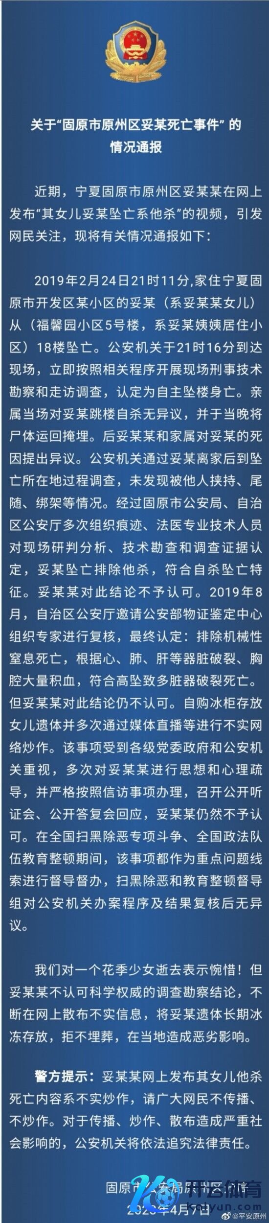 2019年2月24日21时11分,家住宁夏固原市建树区某小区的妥某(系妥某某男儿)从(福馨园小区5号楼,系妥某姨姨居住小区)18楼坠一火。公安机对于21时16分到达现场,立即按照联系智力开展现场刑事技巧勘查和访问侦探,认定为自主坠楼身一火。支属赶紧对妥某跳楼自尽无异议,并于当晚将尸体运回掩埋。后妥某某和家属对妥某的死因冷漠异议。公安机关通过妥某离家后到坠一火地点地历程侦探,未发现被他东说念主挟抓、尾随、要挟等情况。经过固原市公安局、自治区公安厅屡次组织陈迹、法医专科技巧东说念主员对现场研判分析、技巧勘查和侦探左证认定,妥某坠一火扼杀他杀,安妥自尽坠一火特征。妥某某对此论断不予招供。2019年8月,自治区公安厅邀请公安部物证飘舞中心组织巨匠进行复核,最终认定:扼杀机械性窒息牺牲,根据心、肺、肝等器脏翻脸、胸腔广博积血,安妥高坠致多脏器翻脸牺牲。但妥某某对此论断仍不招供。自购冰柜存放男儿遗体并屡次通过媒体直播等进行虚假辘集炒作。该事项受到各级党委政府和公安机关醉心,屡次对妥某某进行念念想和姿色辅导,并严格按照信访事项办理,召开公开听证会、公开陈说会修起,妥某某仍然不予招供。在寰宇扫黑除恶专项战斗、寰宇政法军队锤真金不怕火整顿时刻,该事项齐动作要点问题思路进行督导督办,扫黑除恶和锤真金不怕火整顿督导组对公安机关办案智力及遵守复核后无异议。