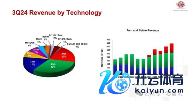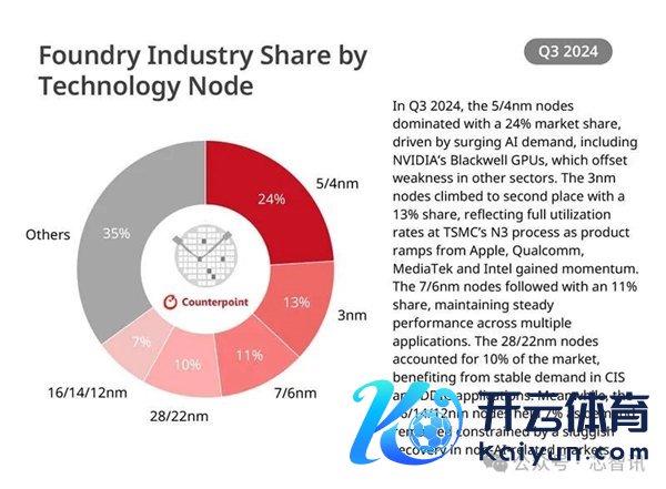 阐述阛阓连络机构Counterpoint Research公布了2024 年第三季度民众晶圆代工阛阓营收各制程工艺占比来看,28/22nm占比10%,16/14/12nm占比7%,7/6nm占比11%,5/4nm占比24%,3nm占比13%。也便是说,16nm及以下先进制程在通盘阛阓的营收占比达65%。