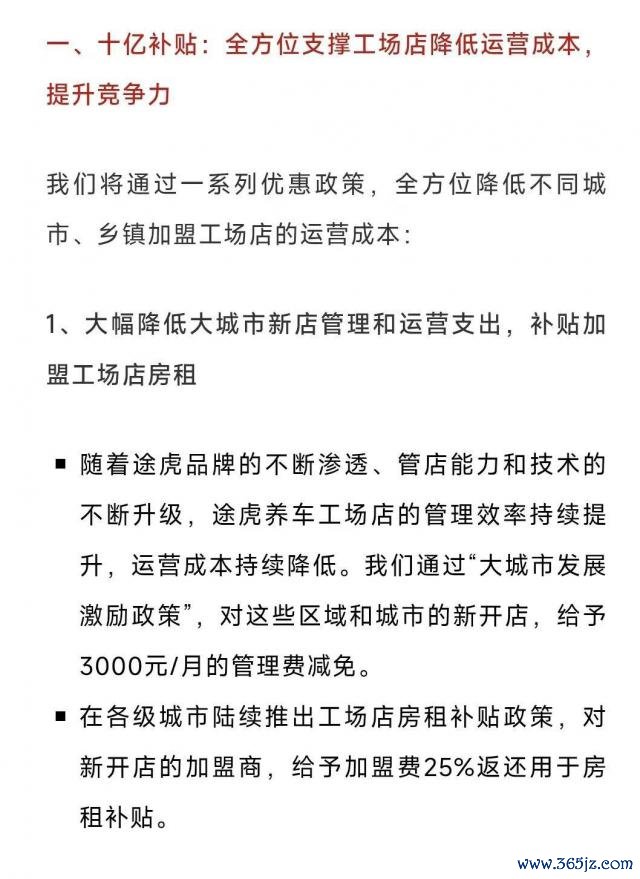 7 月,途虎再次推出加盟补贴策略,补贴主要有两个方面:通过赐与 3000 元 / 月的料理费减免和加盟费 25% 返还来匡助新开店裁减运营资本;还提议百亿流量补贴,精确投放流量,匡助新开门店精确获客。但此时加盟途虎能够靠近较大风险。