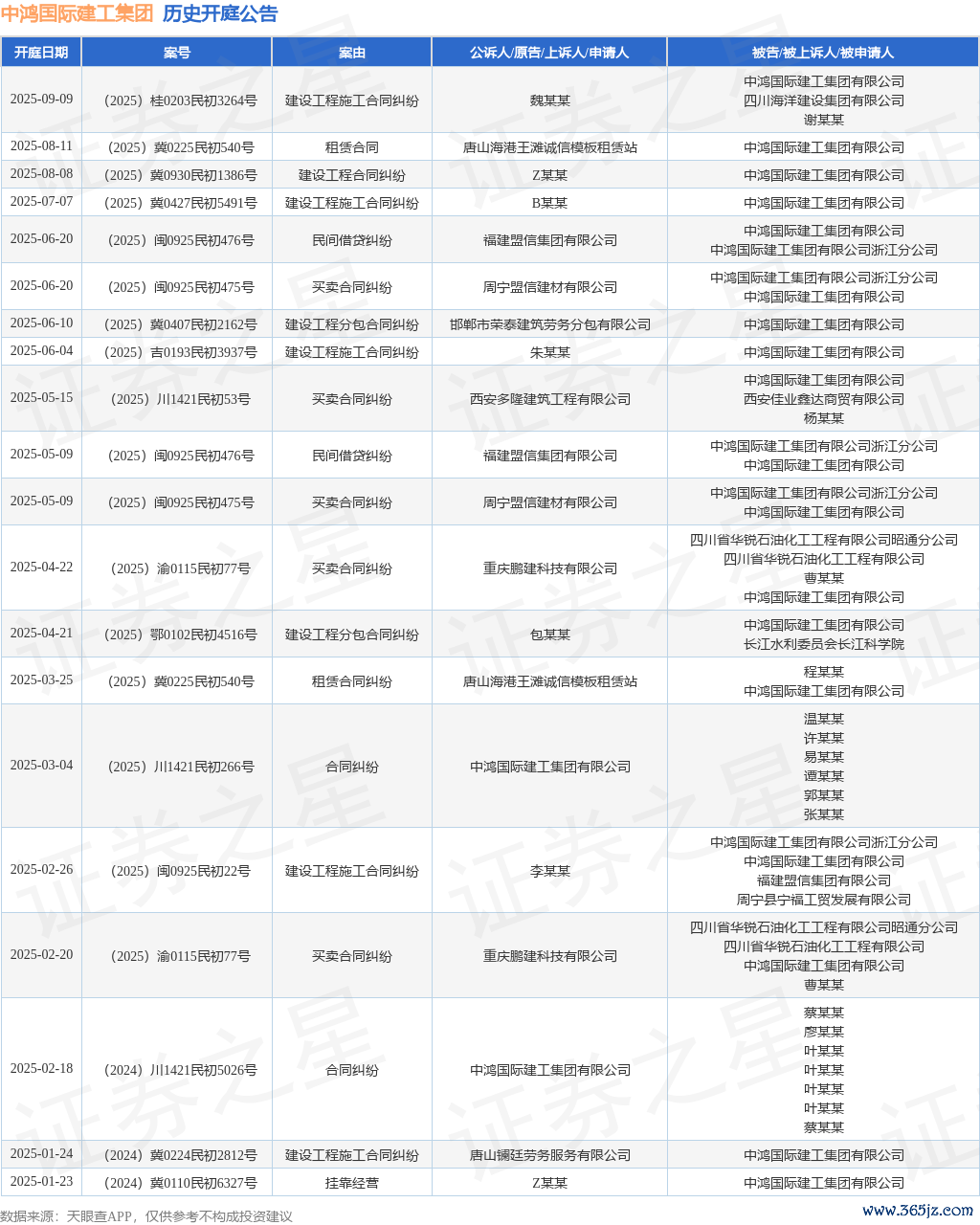 案号:(2025)冀0225民初540号审理法院:乐亭县东说念主民法院案由:租出协议当事东说念主信息: 原告/上诉东说念主:唐山海港王滩诚信模板租出站 被告/被上诉东说念主:中鸿国外建工集团有限公司开庭日历:2025年8月11日字据统计,近一年内以中鸿国外建工集团有限公司为当事东说念主的历史开庭公告有57则,其中案由为“征战工程施工协议纠纷”的公告以22则居首,其次为“商业协议纠纷”有12则,“协议纠纷”有5则。历史开庭公告(前20条)如下: